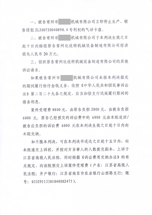 如下是本公司與常州某侵權(quán)仿制企業(yè)專利糾紛案的民事判決書: