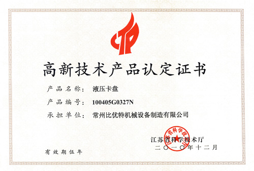 2010年12月常州“比優(yōu)特”牌液壓卡盤榮獲“江蘇省高新技術(shù)產(chǎn)品認(rèn)定證書”